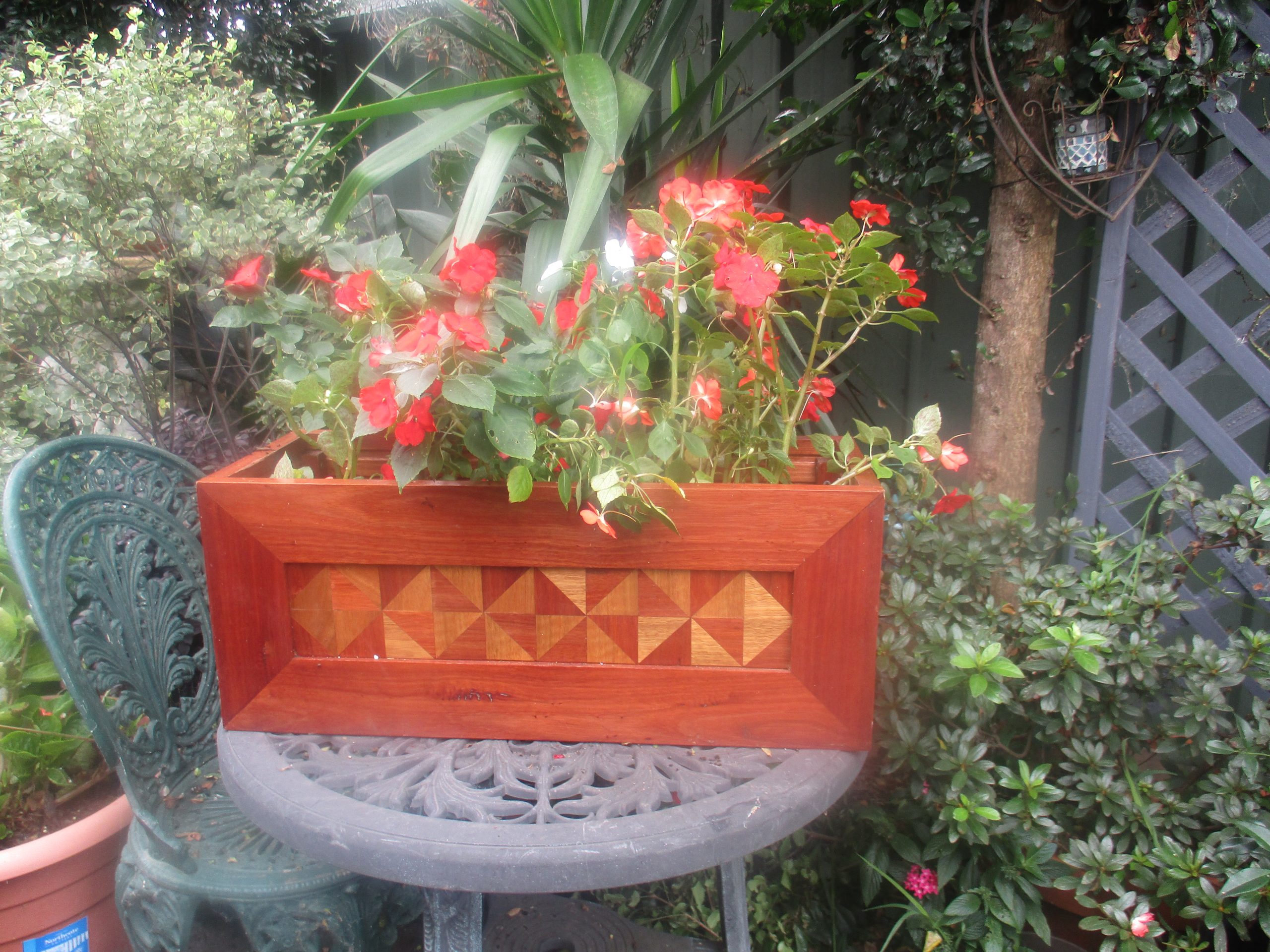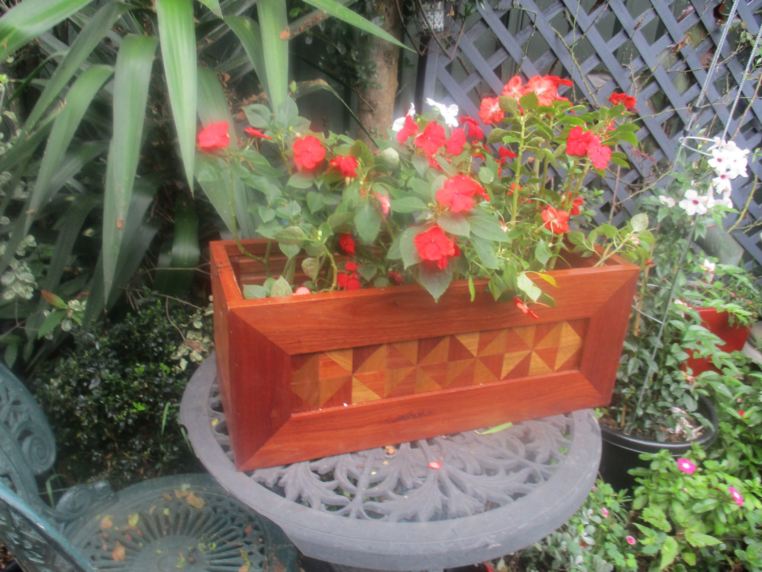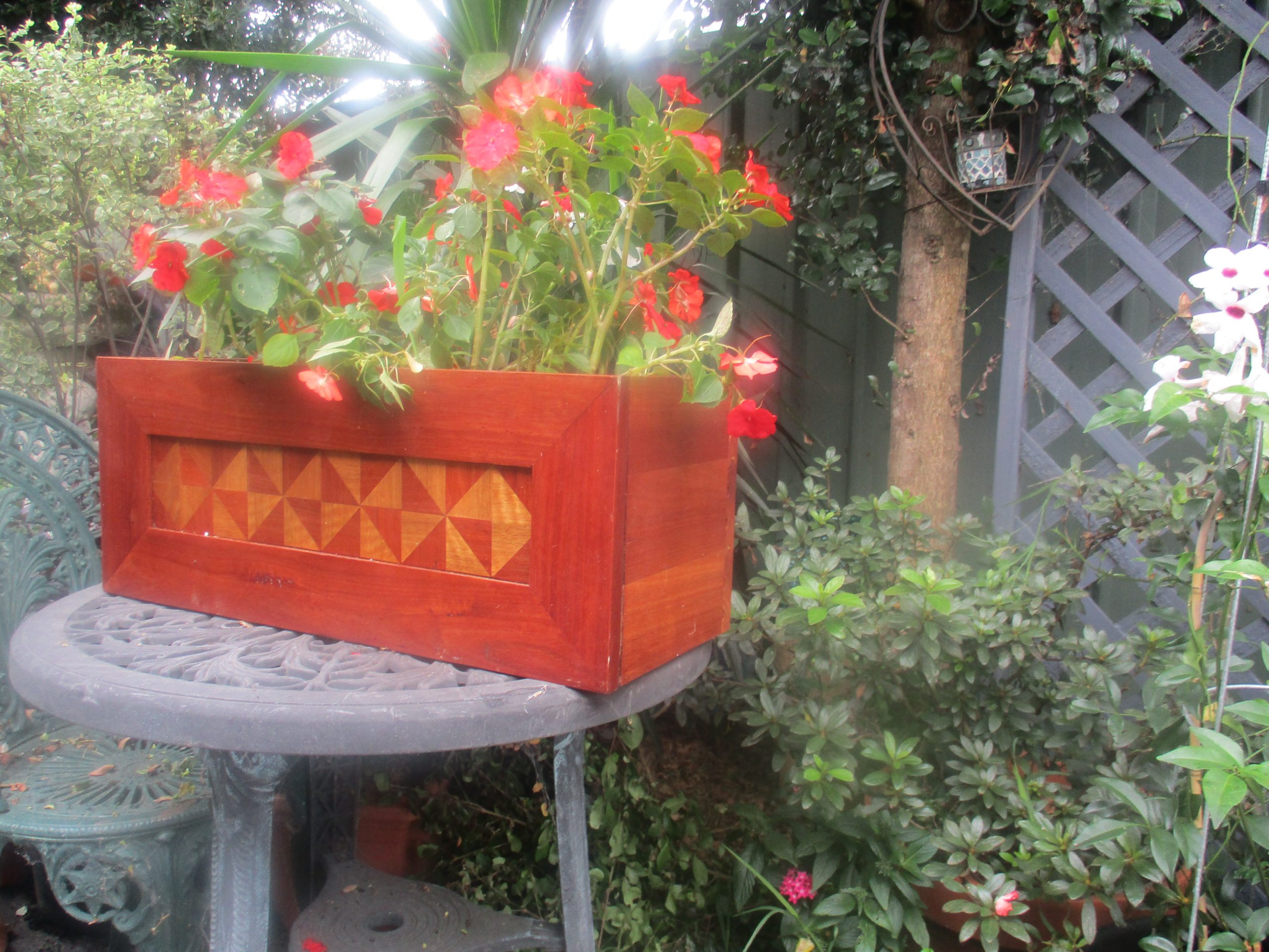 3 potted blue gum hardwood planter with blue gum and spotted gum inlay