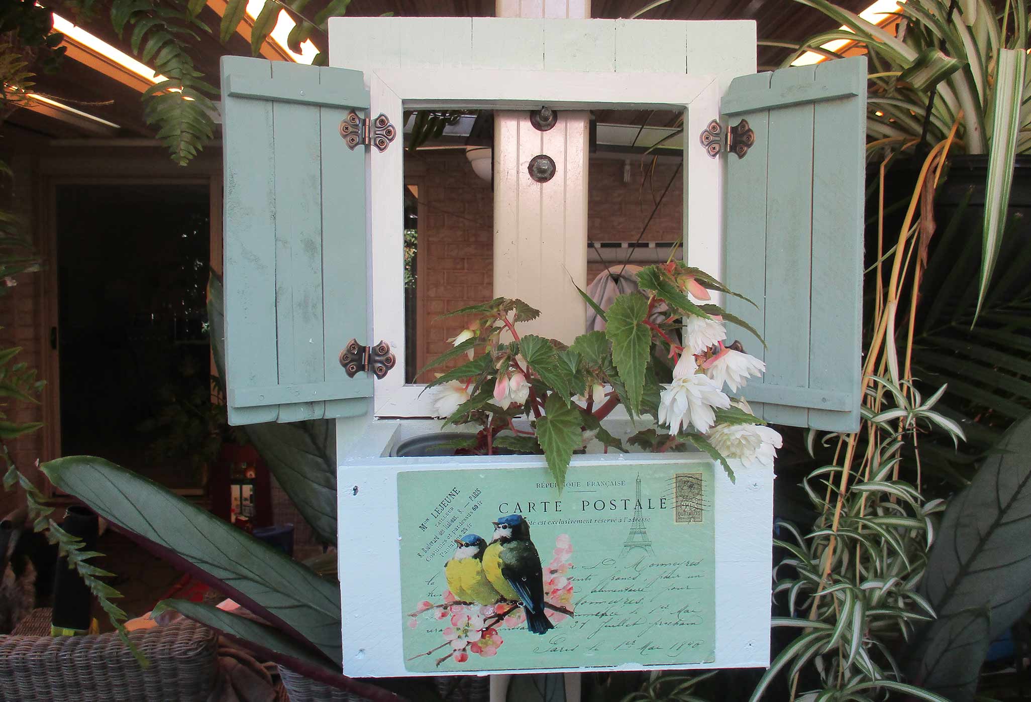 Beautiful handcrafted rustic window sill planters with French shutters, each planter has its own picture decoupaged that’s suitable for outdoors, built with garden palings and added protection of paint for outside, included rope for hanging. Backing is 39cm wide x 52cm height.
